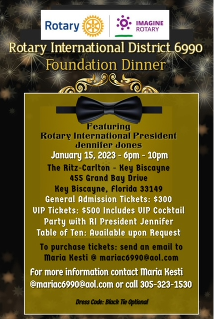 Jennifer Jones President, Rotary International 2022-2023, To raise funds for the Foundation/tickets are limited to 500, of which 100 will be VIPs! Ritz Carlton, 455 Grand Bay Drive, Key Biscayne 33149 on Sunday, January 15th, 2023, 6 pm-10 pm. We have reserved two tables.