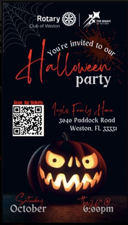 | SAT., OCT 26TH, 2024 @ 6:00 PM THE ROTARY CLUB OF WESTON HALLOWEEN PARTY! |