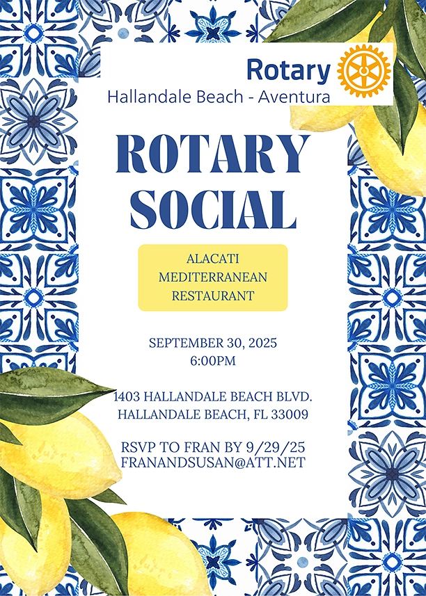 • Sep 30 (Tue) - Rotary Social @ Alacati Mediterranean Restaurant, Hallandale Beach