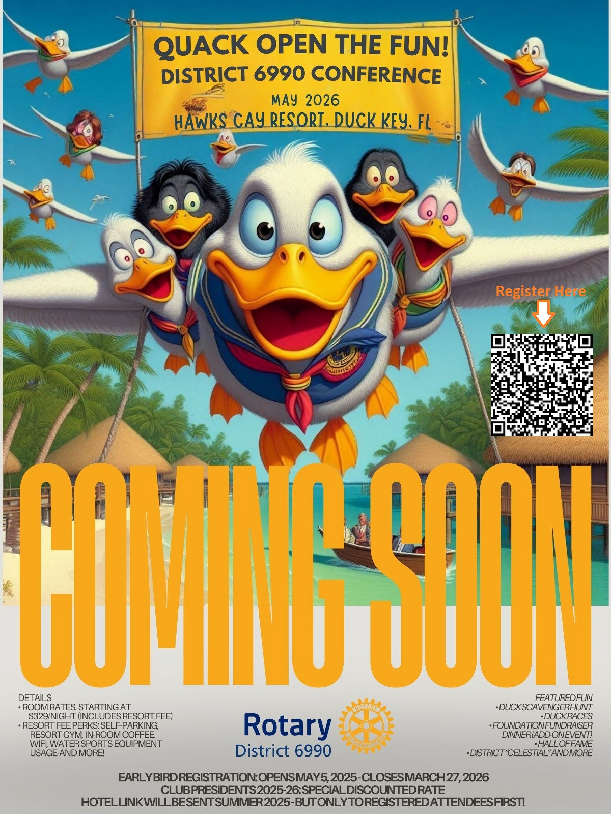 | FRI., MAY 29TH – SAT., 31ST @ HAWKS CAY RESORT, DUCK KEY (FL) DISTRICT 6990 CONFERENCE (COMING SOON!) |