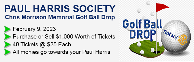Marushka, District 6990 Paul Harris Society Chair, has handed out our annual participation in the 2022-2023 TRF Chris Morrison Memorial Golf Ball Drop Ticket. Each member is asked every year to sell or purchase 4 tickets at $25 each totaling $100. If you have not received your tickets please get in touch with Marushka. If you have not turned in your money and stubs please drop them off at Jesus's at 600 W. Hallandale Beach Blvd or get with Marushka to meet up. All money and ticket stubs need to be turned in by Wednesday, January 18, 2023.