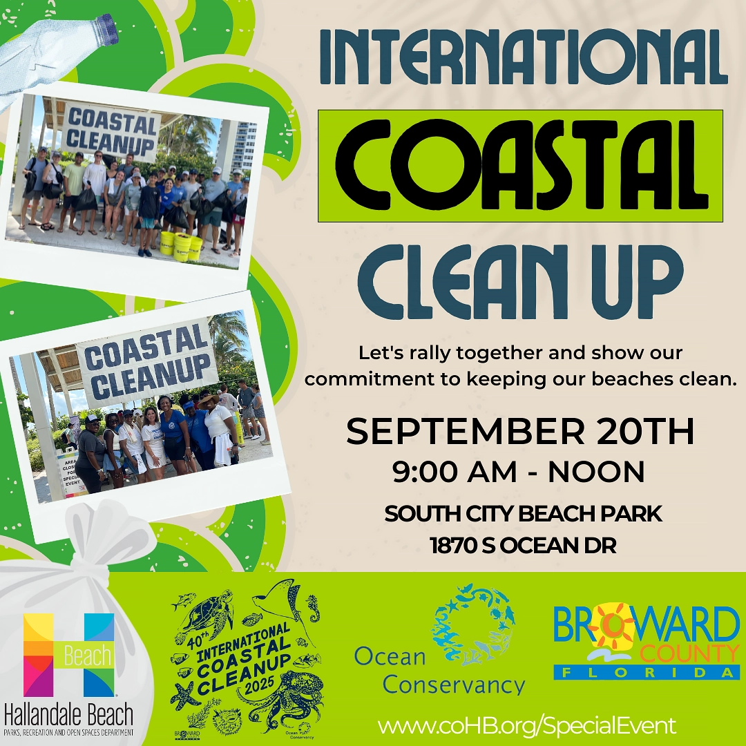 Mark your calendar! The International Coastal Clean Up is happening on Saturday, September 20, 2025, from 9:00 AM to 12:00 PM at South City Beach Park, located at 1870 S Ocean Dr, Hallandale Beach