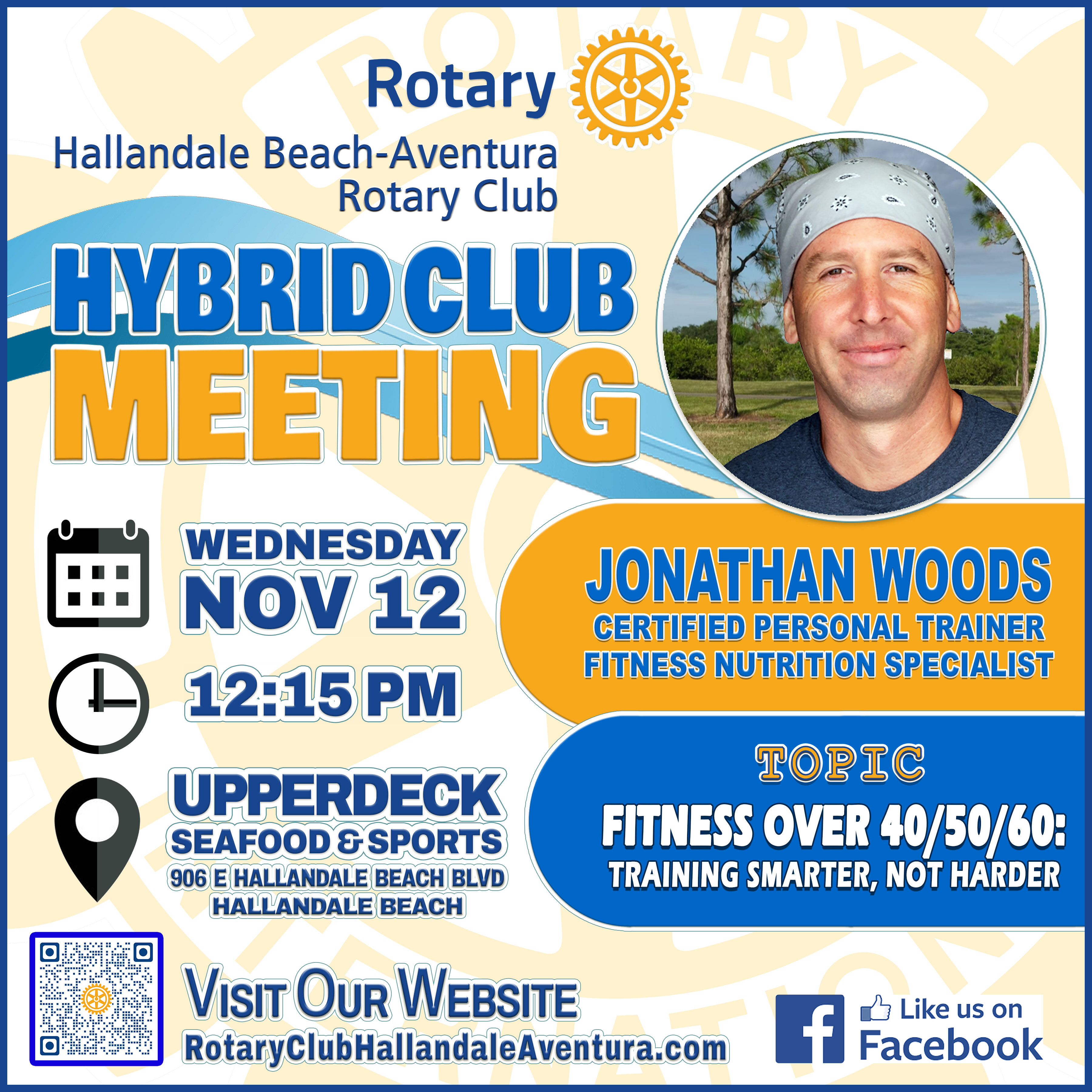 • Nov 12 - Guest Speaker, Jonathan Woods - Topic: "Fitness Over 40/50/60 - Training Smarter, Not Harder"