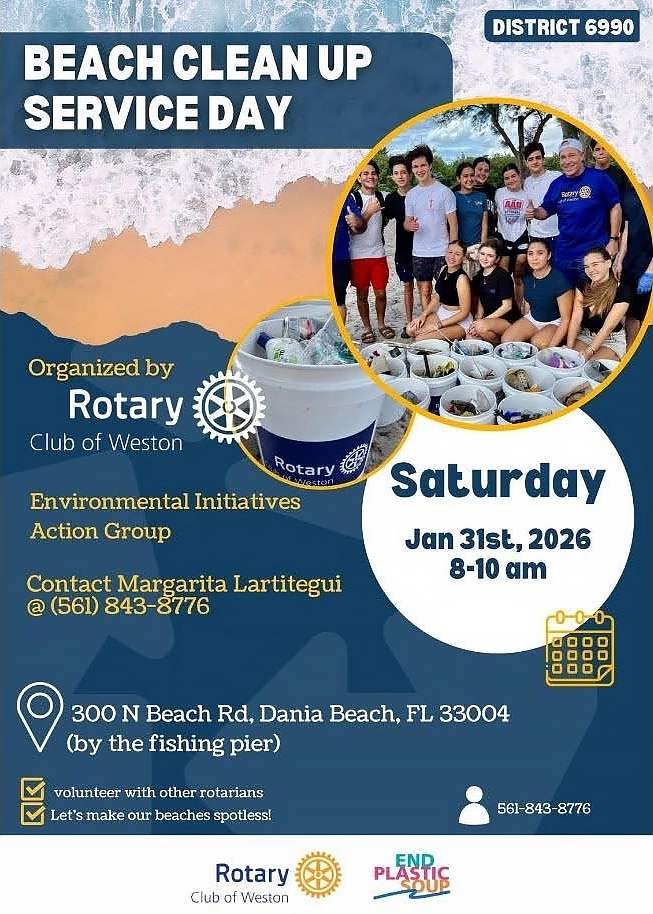 | SAT., JAN 31ST @ 8:00 AM-10:00 AM ON DANIA BEACH ROTARY CLUB OF WESTON - BEACH CLEAN UP SERVICE DAY |