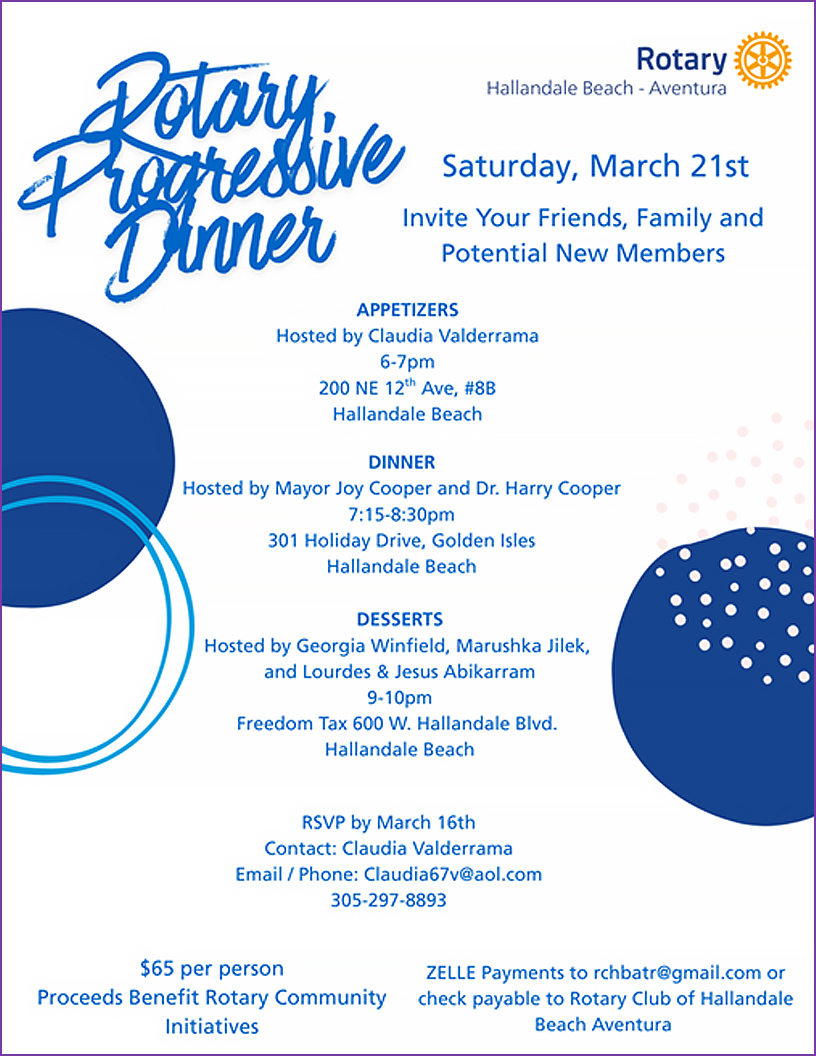 | SAT., MAR 21ST @ 6:00 PM-10:00 PM / 3 LOCATIONS "ROTARY PROGRESSIVE DINNER" |